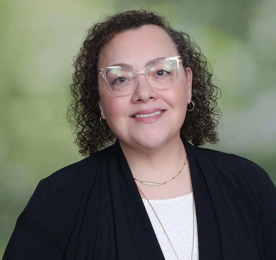 Carolina Quezada is wearing glasses, gold hoop earrings, a black blazer over a white top, and gold jewelry, smiling against a blurred green background.